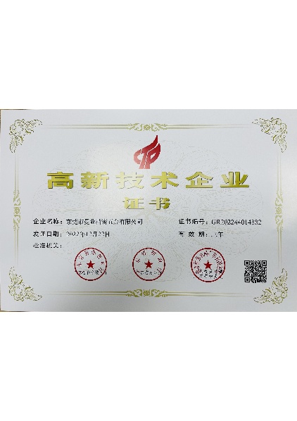 2022-г. Dongguan Manyes присвоен сертификат Высокотехнологичного Предприятия.